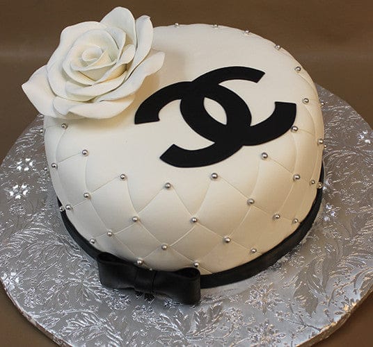 White rolled chocolate cover with quilted pattern on side and silver dragˆš©es at peeks. Rolled chocolate thin black band at base with bow. Black chanel logo on top with large white chocolate rose.