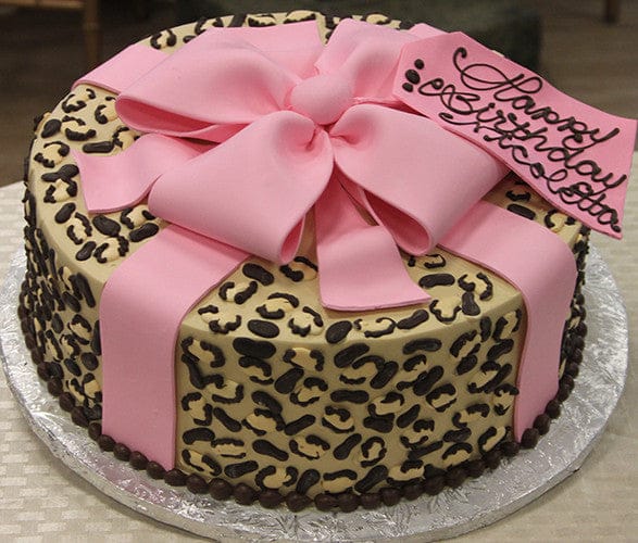 Camel frosting with pink rolled chocolate four loop bow with straps and liquid cheetah print all over.