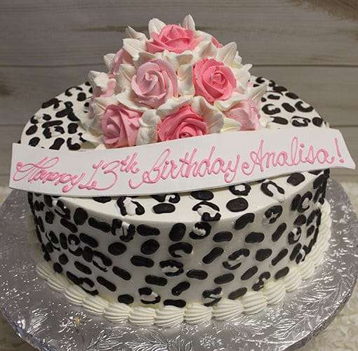 Buttercream frosting with cheetah spot design. Buttercream bouquet on top.