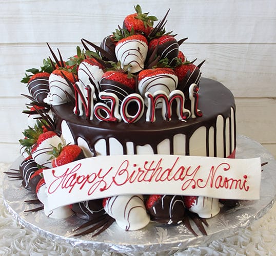 White buttercream frost, ganache drip top, cascade of white chocolate and dark chocolate dipped strawberries, chocolate twigs, red ribbon at base