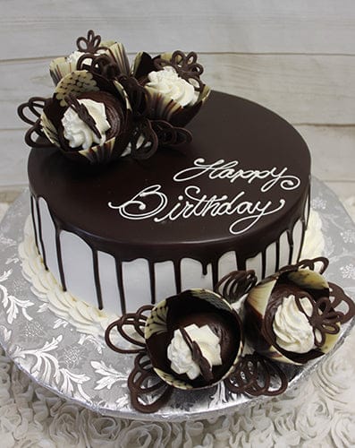 White buttercream with ganache drip. Bouquets of chocolate marbleized tulip cups filled with chocolate mousse and whipped cream. Finished with chocolate filigrees.