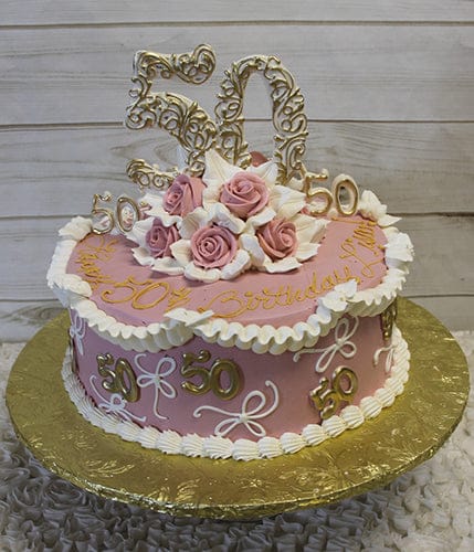 Champagne pink buttercream frosting. Bouquet of buttercream roses in dusty rose with white leaves. Liquid chocolate standing #50 embellished in gold on top, on bouquet and scattered on side.