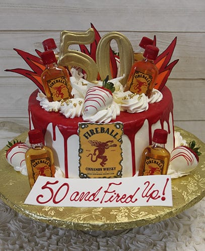 The BD-024F Fireball is a white cake with red drip icing, topped with mini Fireball whisky bottles, red and gold decorations, a gold 50 topper, and a "50 and Fired Up!" sign in front.Fireball Strawberry Nips Cake