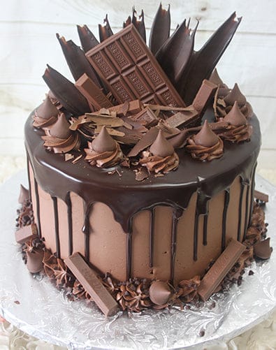 Extra high cake with chocolate buttercream and ganache drip. Ring of Hershey kisses. Cluster of chocolate in center with Hershey bar and Kit Kats.