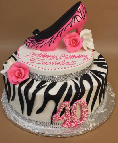 Solid chocolate hot pink high heel on platform with crystal banding and zebra print on shoe. Rolled chocolate black zebra print all over sides. Hot pink number on side with scattered bouquets of rolled chocolate hot pink and white roses.
