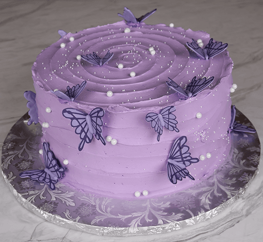 Extra high cake with lavender textured frosting. Scattered butterflies with pearls.