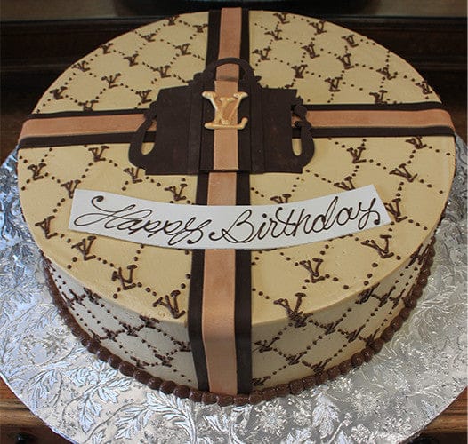 Camel buttercream frosting with Louis Vuitton print all over. Rolled chocolate straps and briefcase in the center. Ԫø