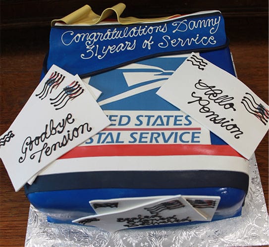 Square cake covered in royal blue rolled chocolate. Postal service retirement theme.