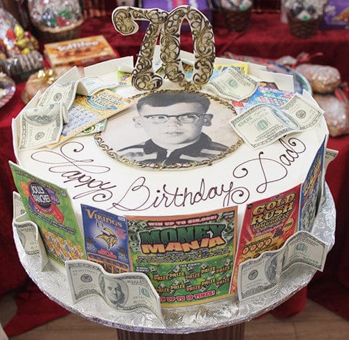 White buttercream frosting with picture scans of scratch tickets and money. Liquid chocolate number standing with picture scan of person. Please call to order. Will need picture to scan at least 48 hours before pick up.