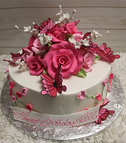 White buttercream frosting with shades of pink rolled chocolate roses on top with white stephanoits. Piped green stems on side with cherry blossoms and scattered liquid chocolate monarch butterflies all over.