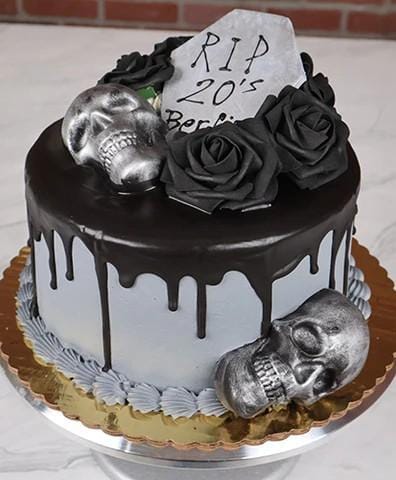 A darkly delicious cake, designed with dramatic black drip, silver skulls, and gothic roses.