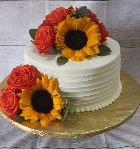 White horizontal buttercream with bouquets of fresh sunflowers, orange roses and greenery.