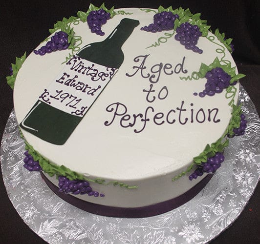 White buttercream frosting with piped purple grapes and green vines on top and side. Eggplant ribbon at base. Green rolled chocolate wine bottle on top with custom label. Please enter the writing for wine label in the inscription tab.