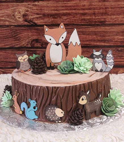 Chocolate frosting with tree trunk design. Liquid chocolate woodland creatures on top and side. Scattered chocolate succulents and pine cones.