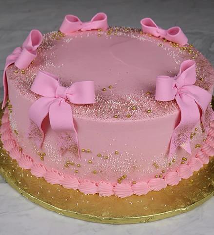 Pink buttercream frosting with pink rolled chocolate bows. Sprinkled with gold dust and pearls.