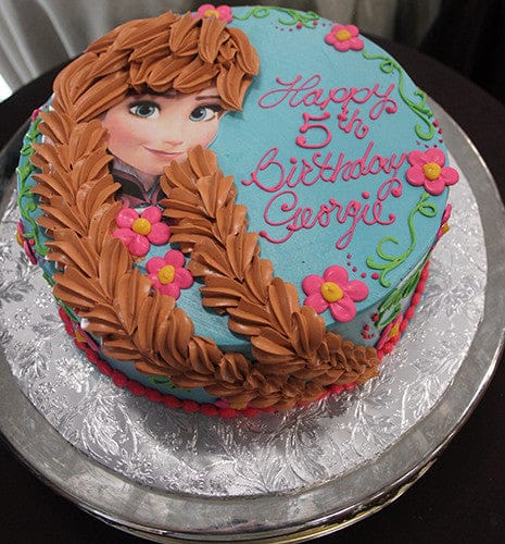 Tiffany blue frosting with picture scan of Anna and light brown buttercream braids. Hot pink liquid chocolate flowers with green vine embellishment on top and side.