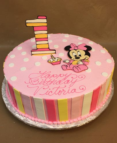 Standing #1 stripe design on top with liquid chocolate baby Minnie and cupcake on top. White polka dots on top. Rolled chocolate straps on side in yellow, white, pink, and hot pink.