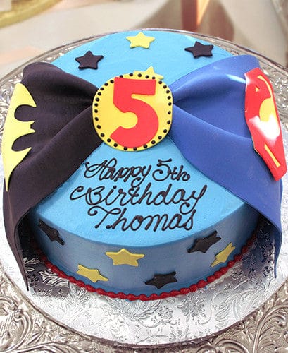 Light blue buttercream with black rolled chocolate batman cape and blue superman cape draped over sides. Yellow rolled chocolate monogram with number on top. Yellow and black rolled chocolate stars scattered on side and top.