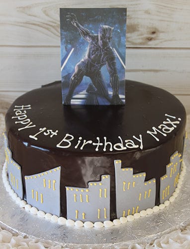 Black Panther picture scan standing with ganache covering and gray skyline on side.
