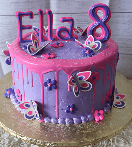 Extra high cake with lavender buttercream frosting. Hot pink drip with butterflies and flowers scattered all over. Standing name and number.
