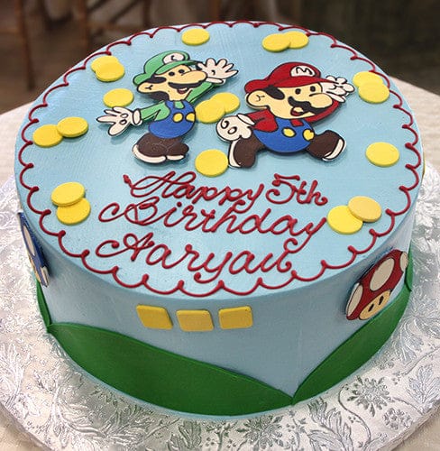 Liquid chocolate Mario characters on top with rolled chocolate coins on top and side with scattered mushrooms, hills, and blocks. Red scallop border on top edge.