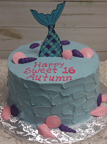 Extra high cake with textured light blue frosting. Liquid chocolate mermaid tale standing with pink and lavender shells scattered all around.