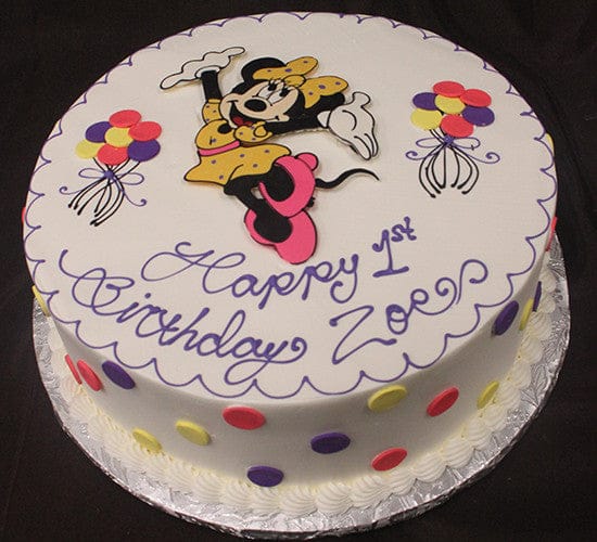 Liquid chocolate Minnie Mouse with rolled chocolate balloons on top in yellow, purple and pink and rolled chocolate polka dots on side. Purple scallop border on top