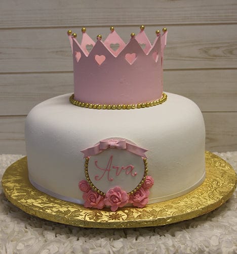 Extra high cake covered in white rolled chocolate. Pale pink crown on top with rose monogram on side. Thin white ribbon at base.