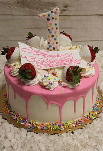 White buttercream frosting with pale pink drip. Ring of white dipped strawberries alternating confetti rosettes. Standing chocolate number with confetti at the base and white chocolate shavings in the center.