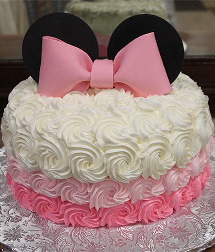Shades of pink buttercream rosettes in ombre style. Rolled chocolate minnie ears with pink bow.