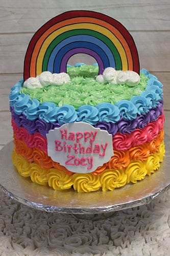 Extra high cake with rainbow rosettes. Liquid chocolate rainbow standing on top.