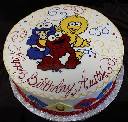 White buttercream frosting. Liquid chocolate baby Sesame Street character in the center on top. Buttercream swirls in red and blue on top with scattered yellow confetti dots on top. Yellow scallop border on top edge. Rolled chocolate diamonds on side – red, blue, and yellow. Red pearl border at base.
