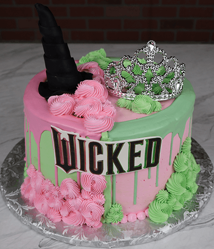 Extra tall cake with Wicked theme.