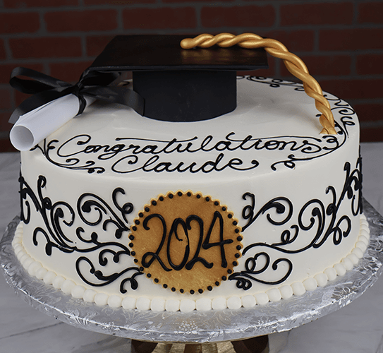 White buttercream frosting with black rolled chocolate graduation cap, gold tassel and ribbon diploma. Black scroll work with gold rolled chocolate monogram.