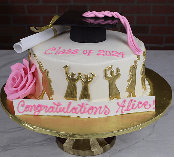White buttercream frosting with gold graduation silhouettes on the side. Pink rolled chocolate rose with black graduation cap on top. Paper diploma with gold ribbon.