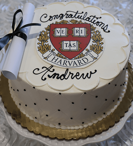 White buttercream frosting with blacks dots on side and diploma with black ribbon. School logo on top.