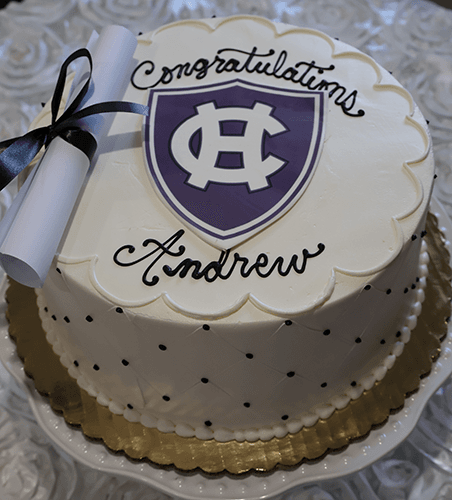 White buttercream frosting with blacks dots on side and diploma with black ribbon. School logo on top.