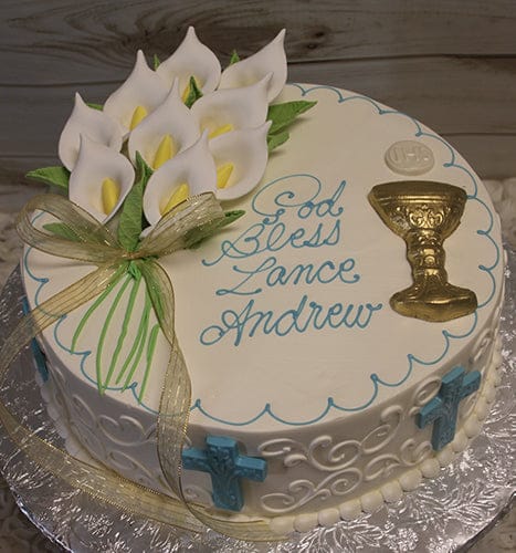 Small bouquet of white rolled chocolate calla lilies with yellow centers and green stems. Leaves tied with a gold ribbon. Gold communion challice on top with blue scallop border around top edge. Solid blue crosses on side with white scroll in between.