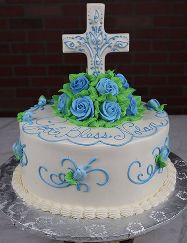 White buttercream frosting. Bouquet of buttercream roses in shades of blue with green leaves. Solid white chocolate cross in center embellished in blue. Light blue scallop border around top edge. Blue open scroll with rosettes on side and on top edge.
