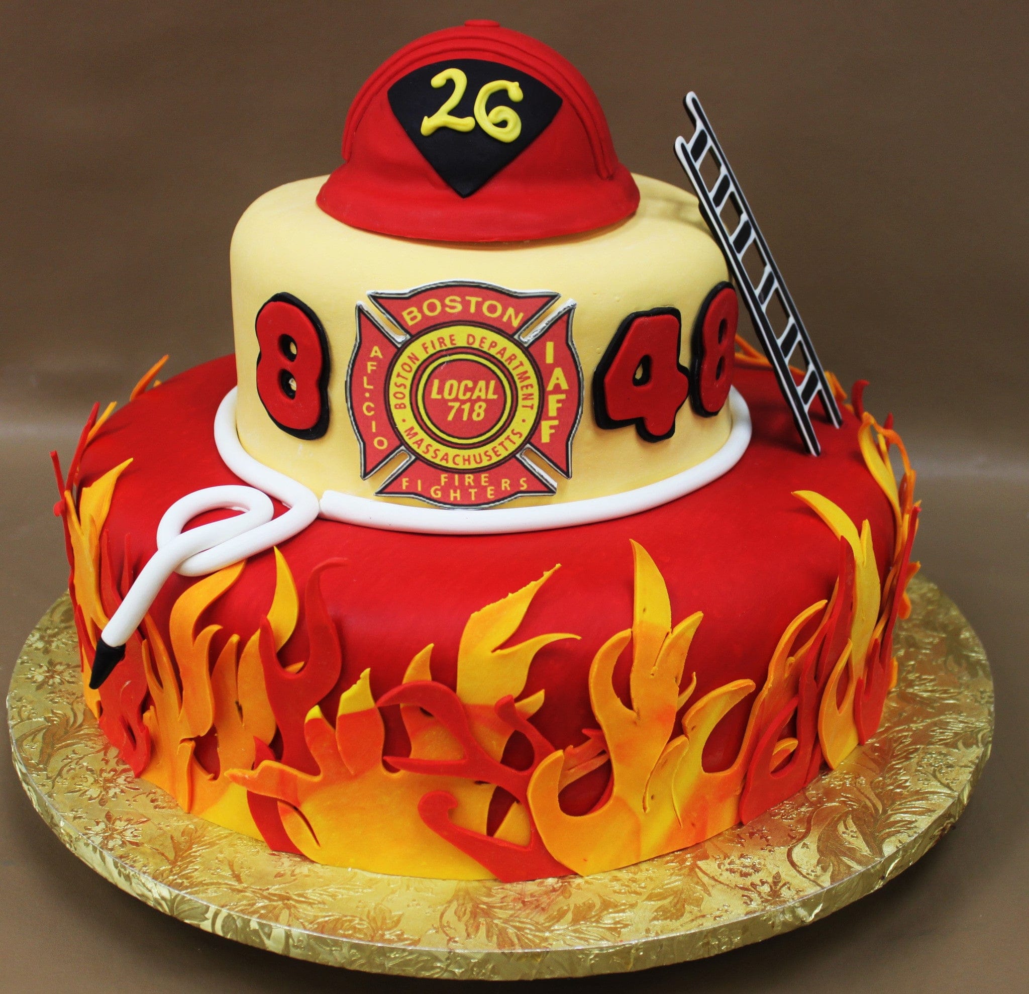 Firefighter themed 2-Tier cake, with the first tier in red with flames in yellow, orange and red, a fire hose. The second tier is pale yellow with a ladder leaning, an IAFF patch, and your station number. On the top of the second tier is a red helmet with your badge number.