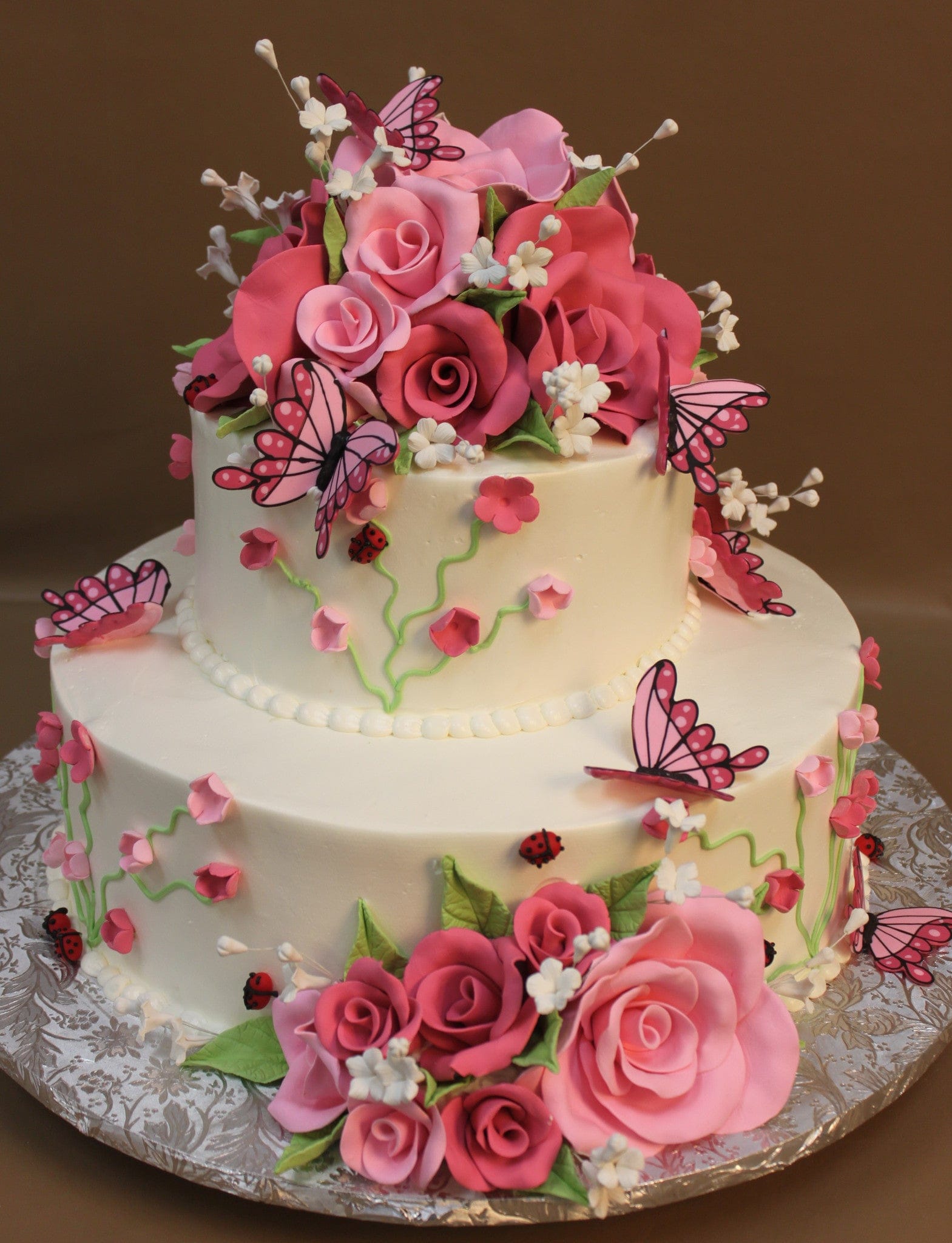 Shades of pink rolled chocolate roses. Scattered cherry blossoms with green stems. Finished off with monarch butterflies and lady bugs.