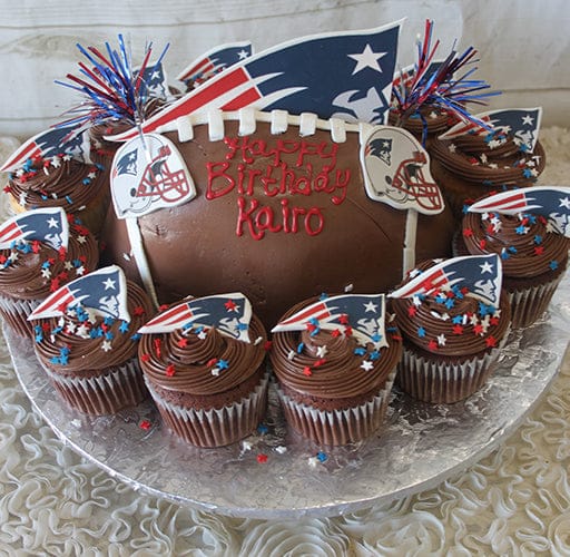 Chocolate buttercream frosted football shaped cake with Patriots logo made out of rolled chocolate. Plastic figure helmets on either side. Chocolate cake. Includes 12 cupcakes.