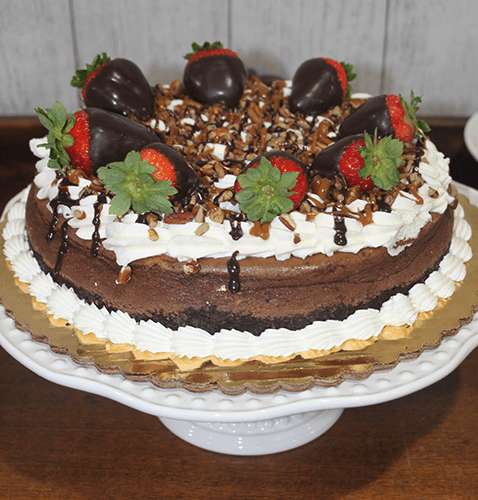 Chocolate cheesecake with chocolate covered strawberries, whipped cream, caramel, ganache and pecans.