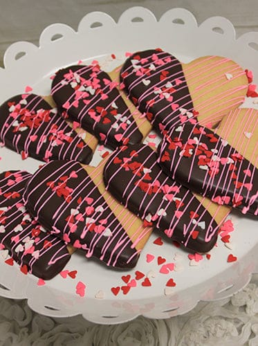 Sugar cookie dipped in chocolate with pink drizzle and heart sprinkles.