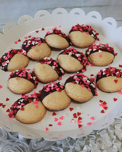 Almond macarons dipped in chocolate with valentine sprinkles.