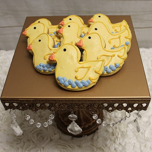 Duck Cookies. Sugar cookie dipped in yellow chocolate with duck design. You can order cookies bagged and bowed with blue ribbon as well. If you would like to change the color of ribbon please call the bakery directly to place order.