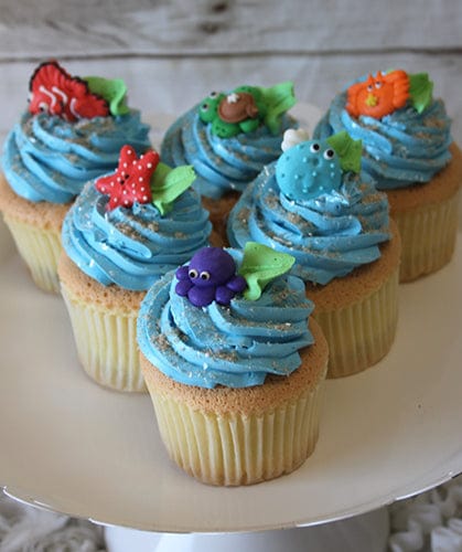 Light blue buttercream frosting with assorted sugar sea creatures, sand and edible glitter.
