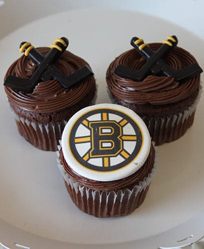 Bruins logo and chocolate hockey sticks.