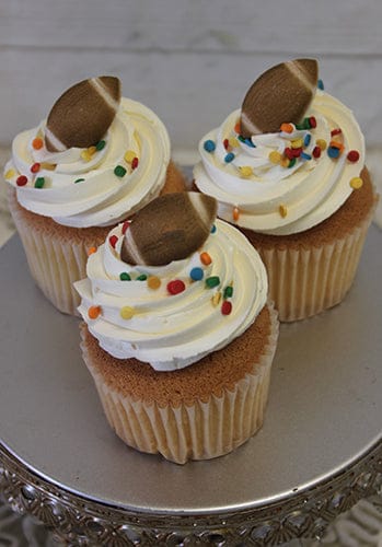 White buttercream frosting with sugar football and confetti.