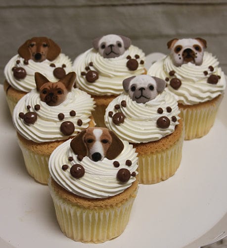 White buttercream frosting with sugar dog face and chocolate paw prints.